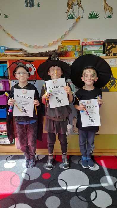 Na závěr jsme vyhlásili tři nejoriginálnější čarodějnické převleky. V tajném hlasování získali nejvíce hlasů Ondra Horáček, Péťa Krahula a Alešek Kovář. Kluci si odnesli diplom a drobné odměny. Nikdo ale nepřišel zkrátka, všechny čarodějnice a čarodějové dostali svítící náramek, pitíčko a chutného červíka.