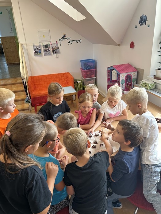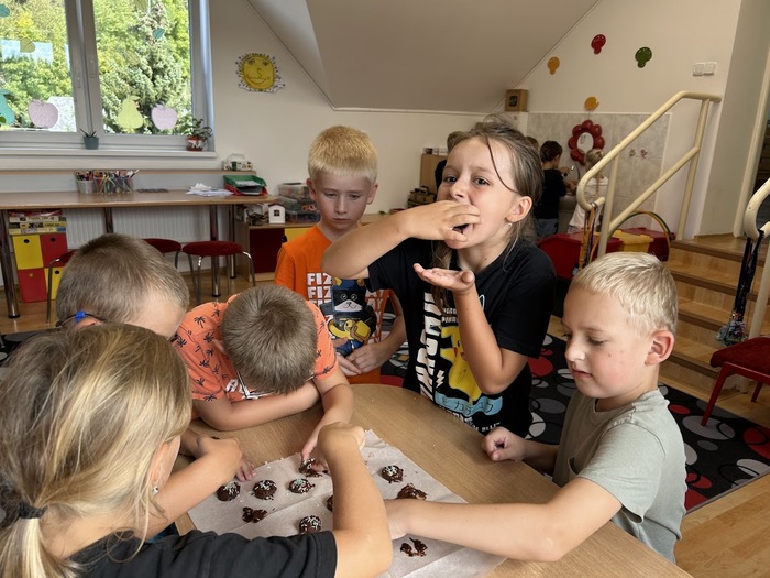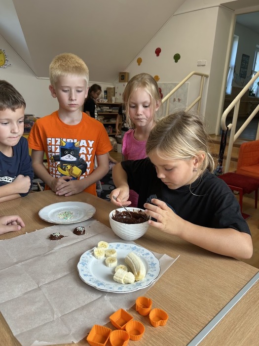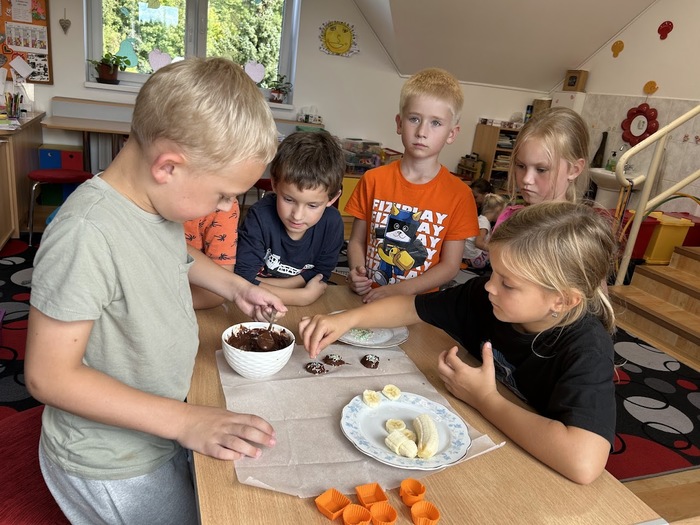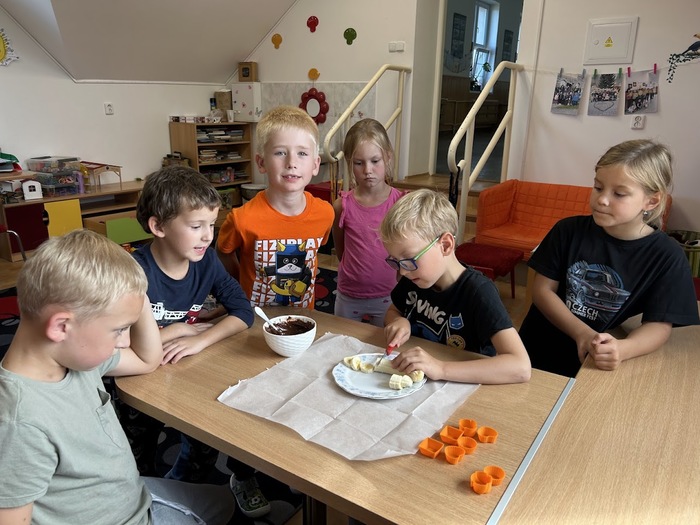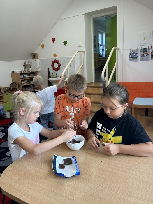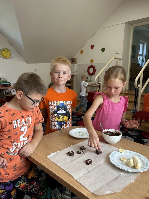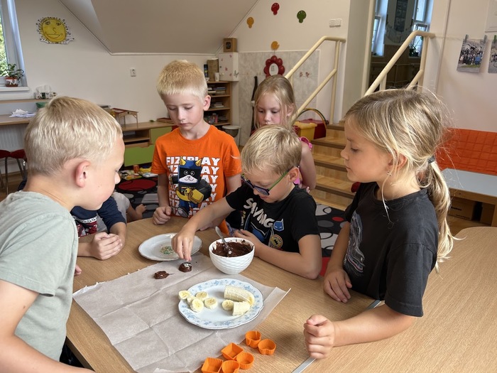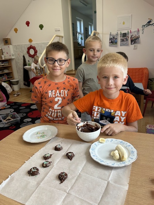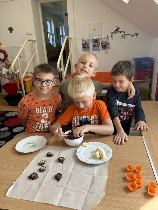 Minulý týden, který jsme věnovali tématu ovoce, jsme v pátek zakončili sladkou tečkou. Připomněli jsme si Mezinárodní den čokolády, který připadá na 13. září. Dozvěděli jsme se mnoho zajímavostí o této oblíbené pochoutce, zahráli si zábavné čokoládové hry a společně připravili banány v čokoládě, na kterých jsme si všichni pochutnali.