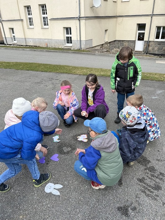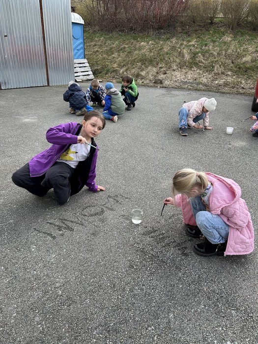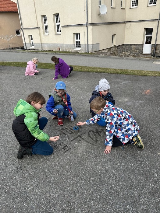 Venku jsme si vyzkoušeli malování vodou na chodník a pozorovali přitom její postupné vypařování. Děti také luštily a pracovaly s Albi tužkou a interaktivní knihou Člověk a příroda.
