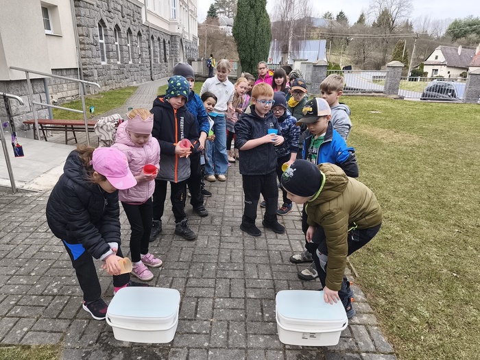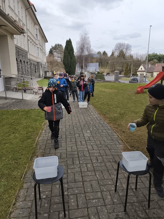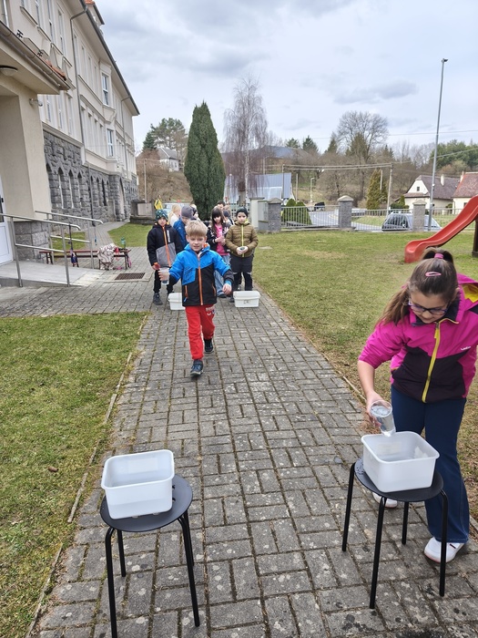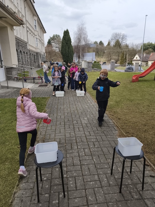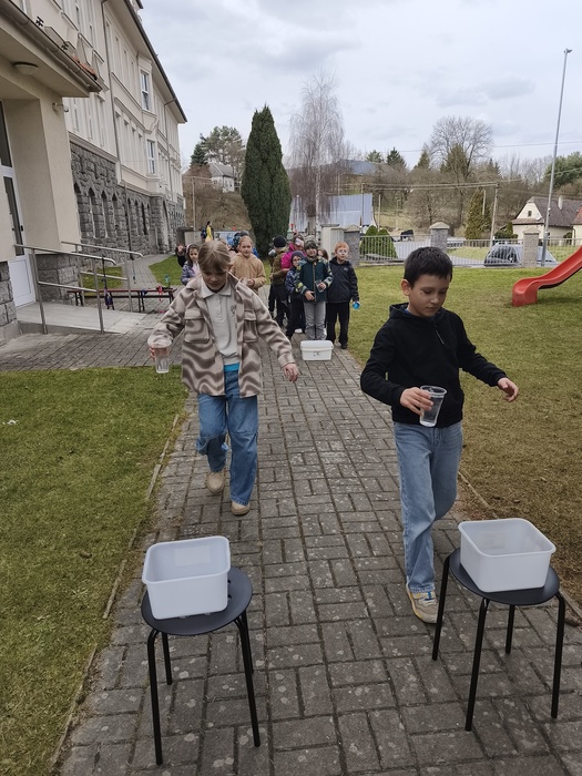 Následně jsme se všichni přesunuli na školní zahradu, kde děti soutěžily s vodou. Výsledky byly velmi vyrovnané, a tak bylo nutné některé disciplíny zopakovat. Děti si odpoledne s vodou náramně užily a už se těší na další projekty.