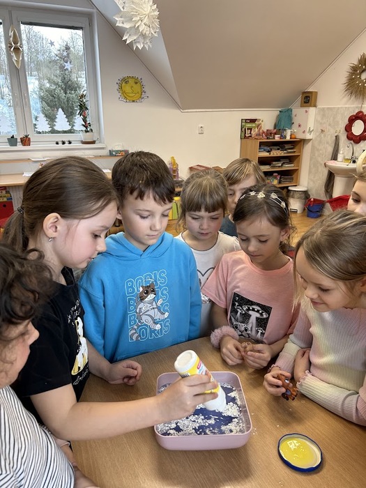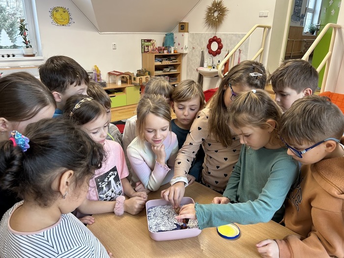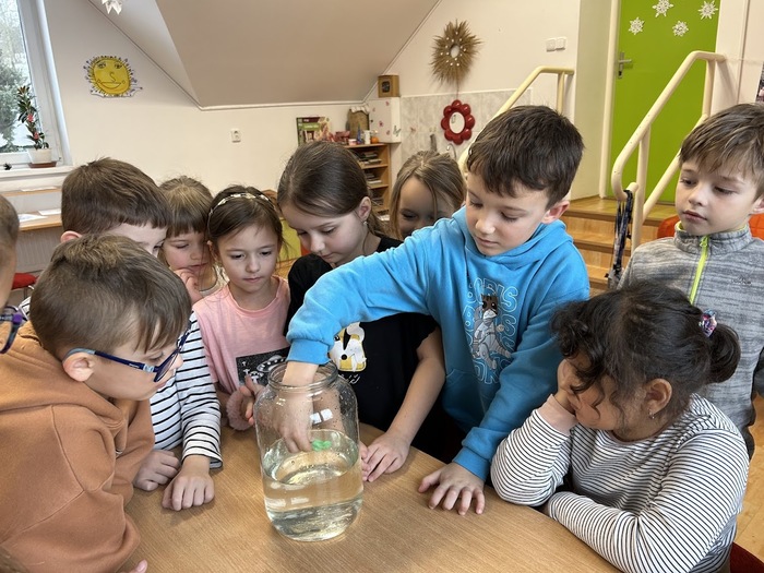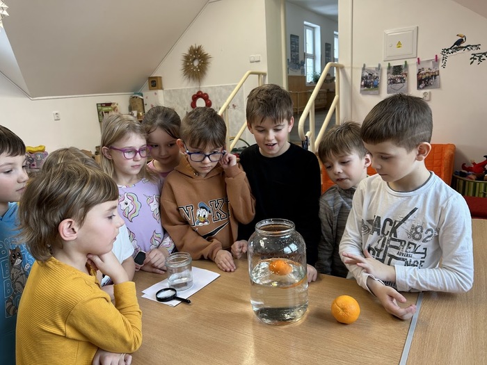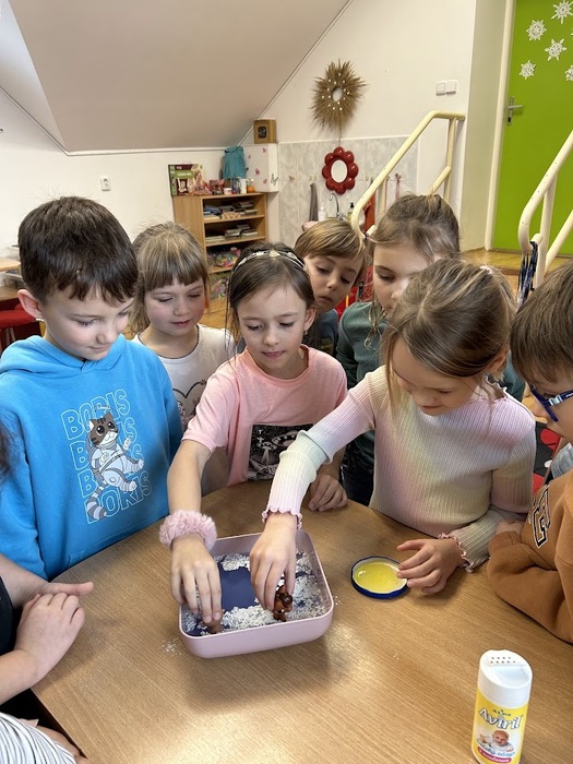 Ukázali jsme si experiment s pomerančem ve vodě a společně vymýšleli, jak udržet plastelínu na hladině. Použitím obarvené vody, dětského zásypu a jaru jsme vytvořili praskající „kry“. Děti se pomocí lupy přesvědčily, že sníh není tak čistý, jak by se mohlo na první pohled zdát, a že tedy není vhodné ho ochutnávat.