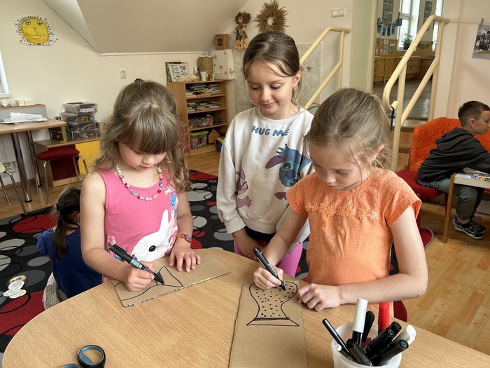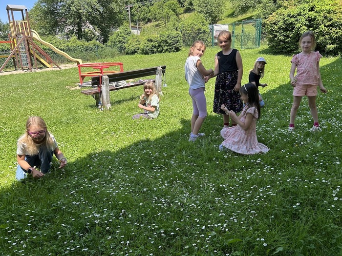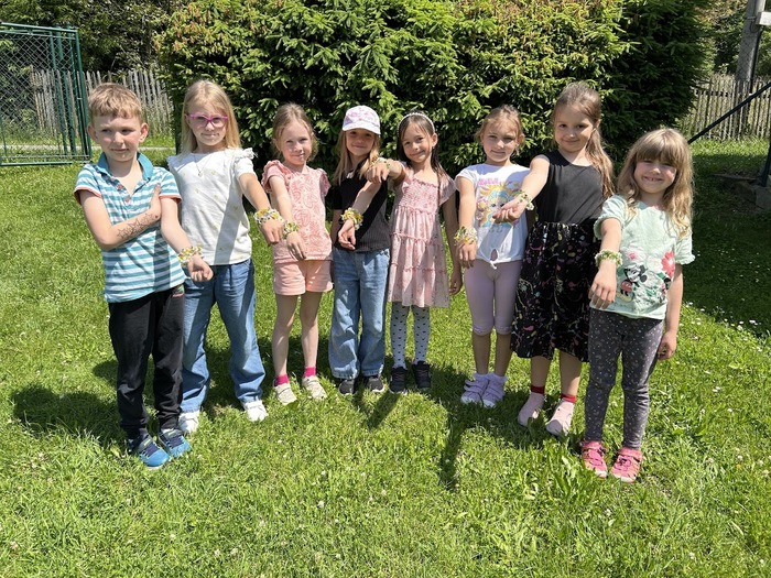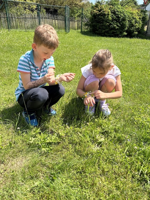 Velký úspěch měla detektivní hra, při které děti ve skupinkách pátraly například po něčem voňavém, něčem pichlavém a podobně. Vytvořili jsme si také jednoduché náramky z izolepy, které jsme nazdobili kvítky a lístečky.