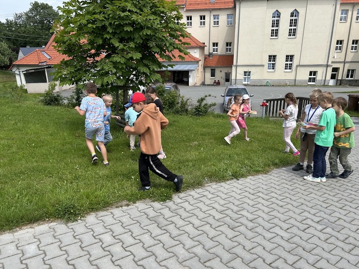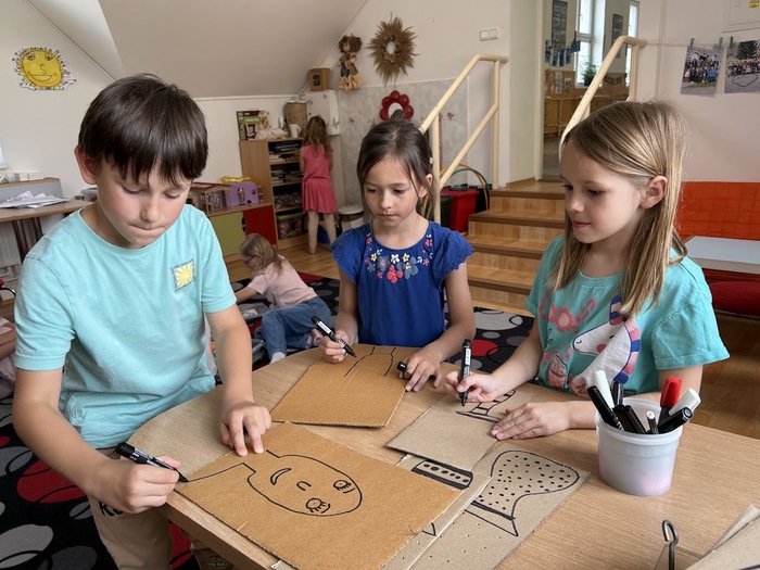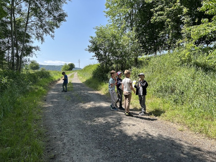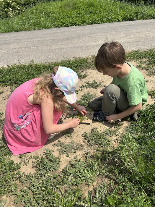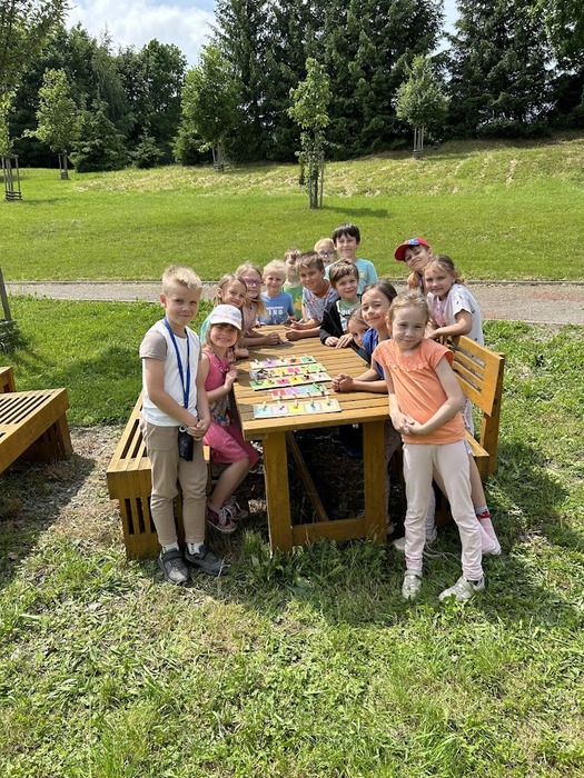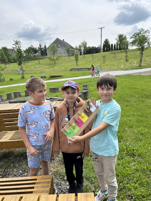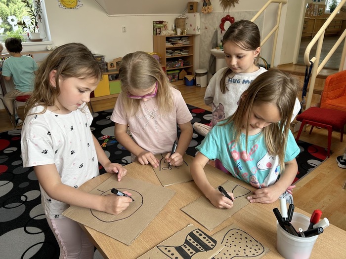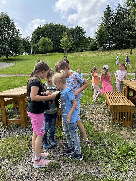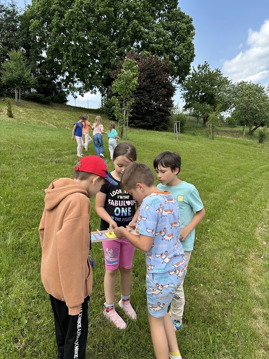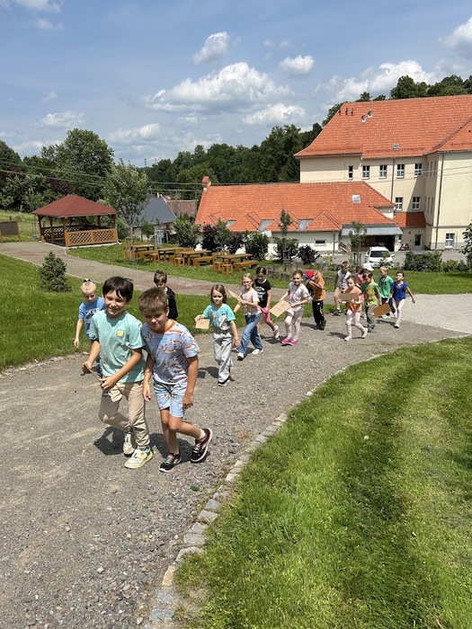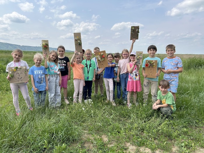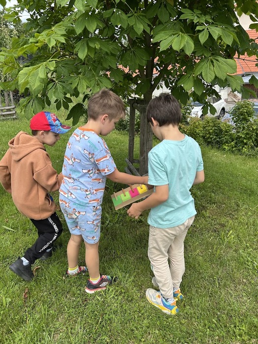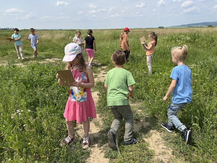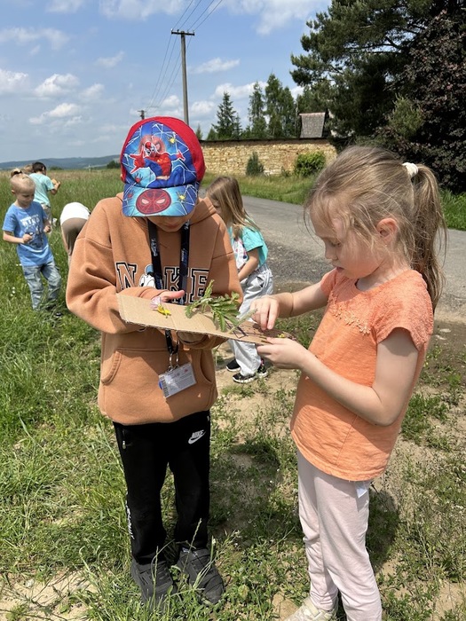 Během pobytu venku si děti vyzkoušely několik zábavných přírodních aktivit, které je opravdu zaujaly. Prvňáčci a druháčci hledali přírodniny podle barvy a ve dvojicích dokončovali obrázky nakreslené na kartonu, kdy místo barev použili květy a listy.