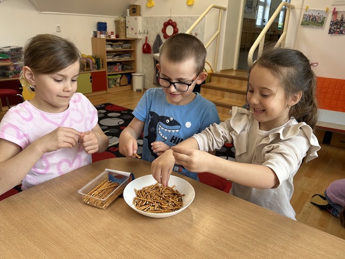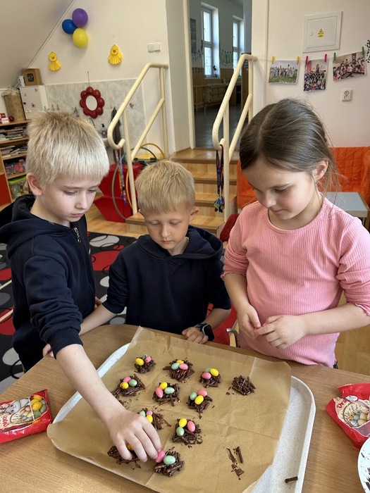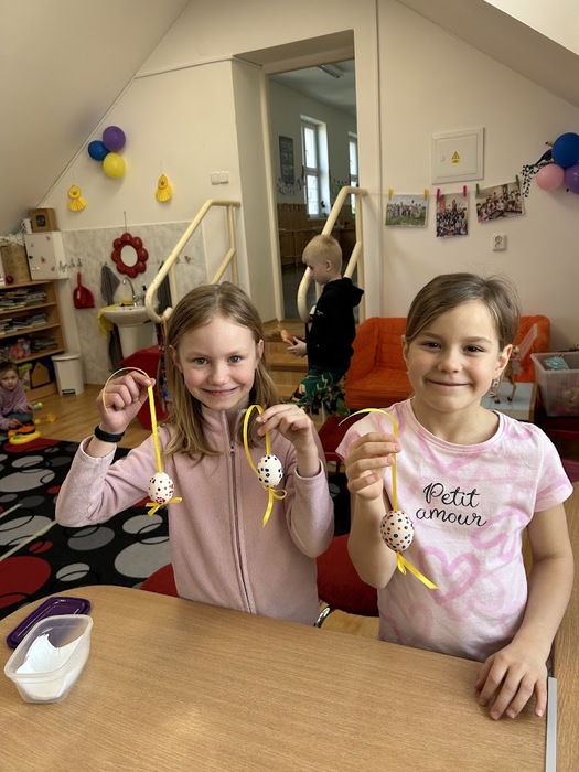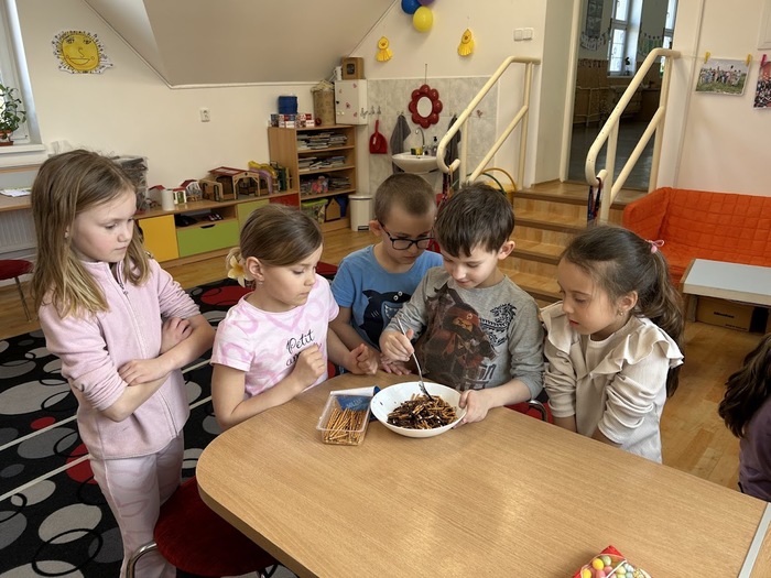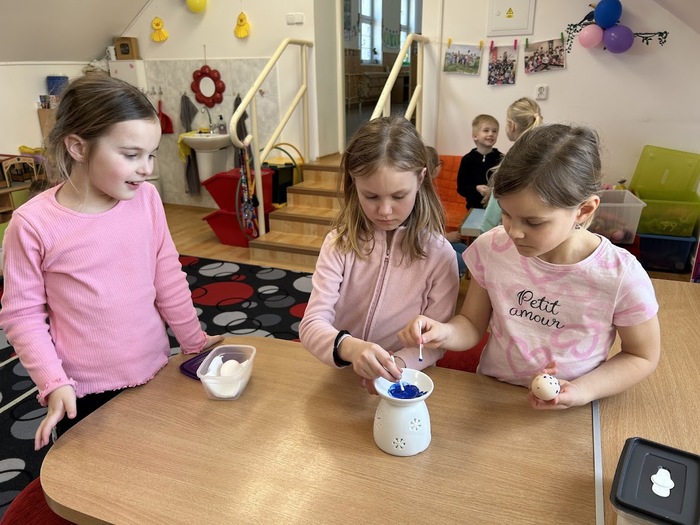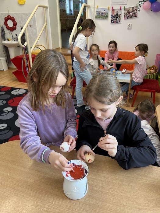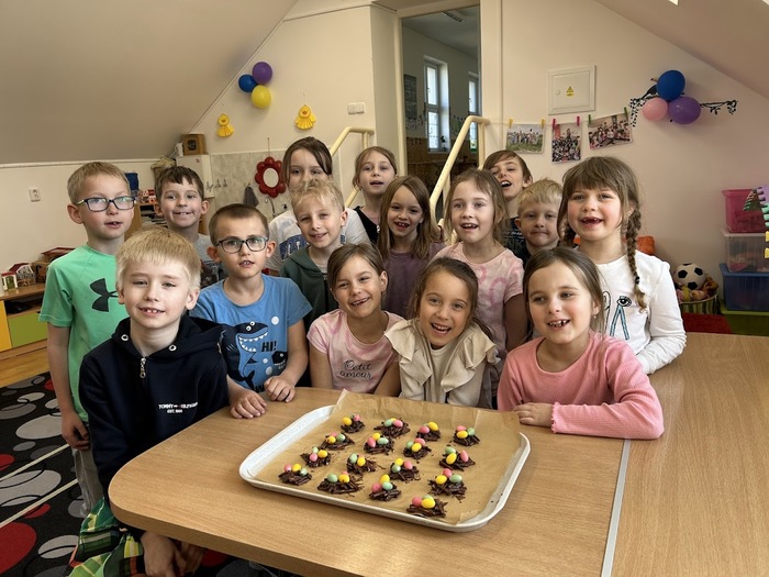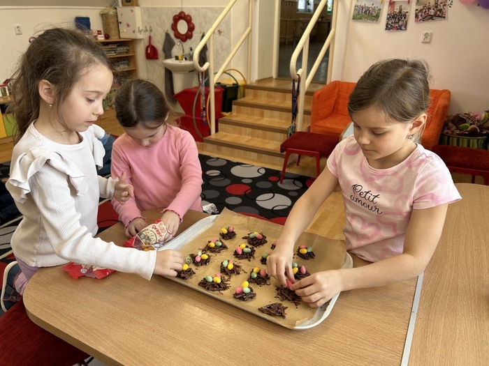 Poslední den před velikonočními prázdninami jsme si ve školní družině oddělení A opravdu užili. Děti si ozdobily vyfouknutá vajíčka voskovou technikou. Poté jsme se pustili do přípravy nepečených hnízdeček z čokolády a slaných tyčinek, která jsme dozdobili barevnými vajíčky. Po ochutnávce jsme se vydali ven, kde byla pro děti připravena velikonoční stezka s úkoly a překvapením na konci. Nechyběly ani veselé hry s vajíčky.