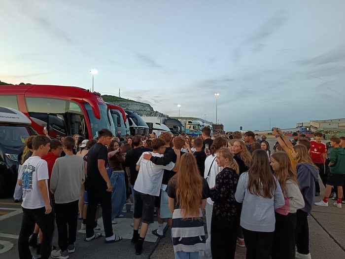Cesta nás zavedla do přístavního Doveru, kde nás na parkovišti čekalo milé překvapení – naši žáci se zde potkali s několika autobusy českých i německých studentů. Během chvilky vznikla spontánní mezinárodní diskotéka. Hudba hrála z reproduktorů, parkoviště se proměnilo v taneční parket a jazykové bariéry jako by ani neexistovaly. Byl to nádherný moment radosti, uvolnění a přátelství.