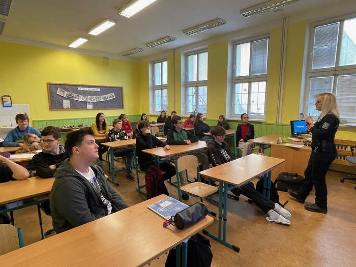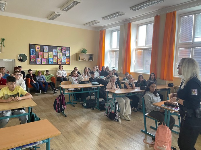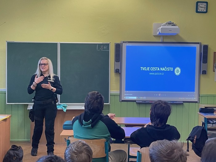 Ve středu 8. dubna proběhly na naší škole preventivní besedy ve spolupráci s Policií ČR, které byly tematicky přizpůsobeny věku žáků. Do školy zavítala policejní preventistka por. Mgr. Nikol Zavřelová z Krajského ředitelství policie Pardubického kraje.