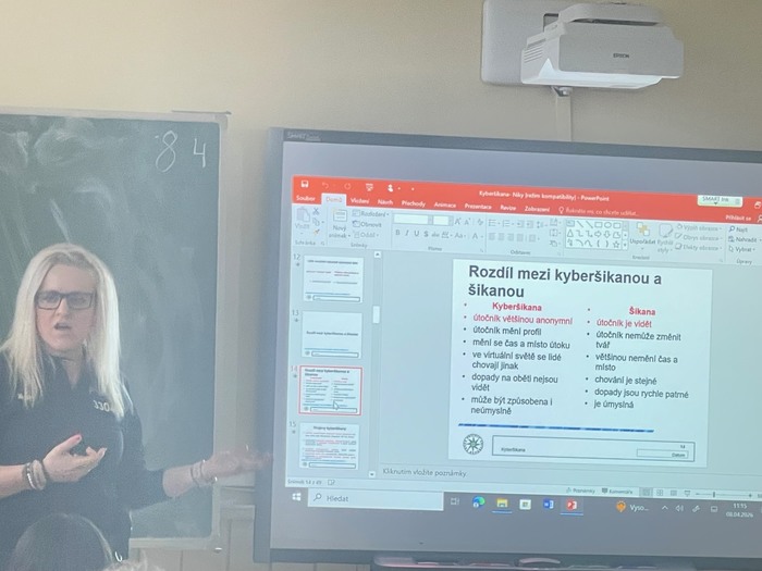 Pro žáky 6. a 7. třídy byla beseda zaměřená na problematiku kyberšikany, která jim přiblížila nástrahy současného online světa. Kyberšikana, tedy ubližování prostřednictvím internetu nebo mobilních zařízení, patří mezi stále častější problémy, se kterými se děti mohou setkat. Součástí programu bylo také vysvětlení pojmu kybergrooming – situace, kdy se útočník snaží navázat důvěrný vztah s obětí a následně ji může vystavit nebezpečí.