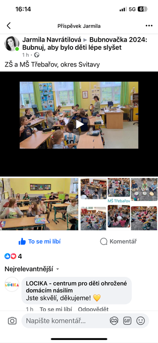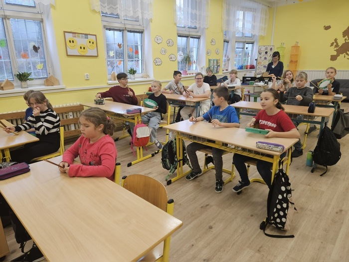 My jsme se také připojili a po 10. hodině dopolední se školou neslo bubnování za doprovodu písně Life is life (Život je život) – ze všech tříd 1. a 2. stupně, ze sborovny a ředitelny, ze školní kuchyně – přidaly se paní kuchařky, ze školní chodby – bubnovala paní uklízečka s panem školníkem. Svoje hlasy připojila i mateřská škola.