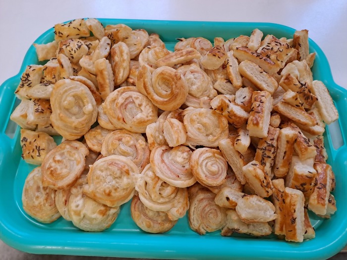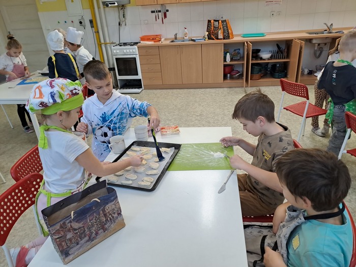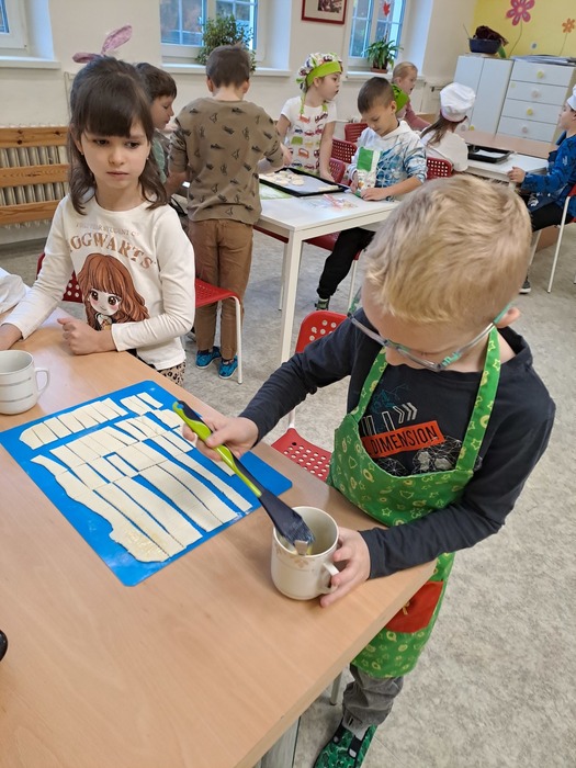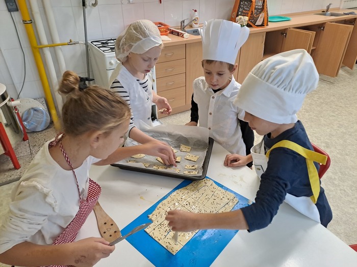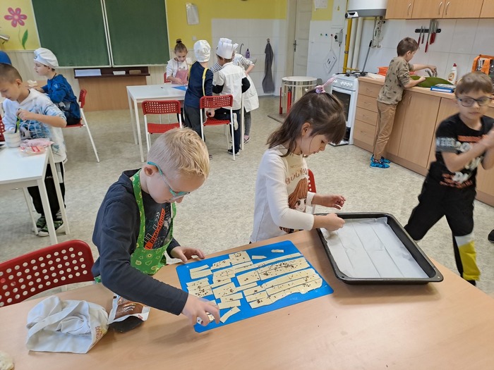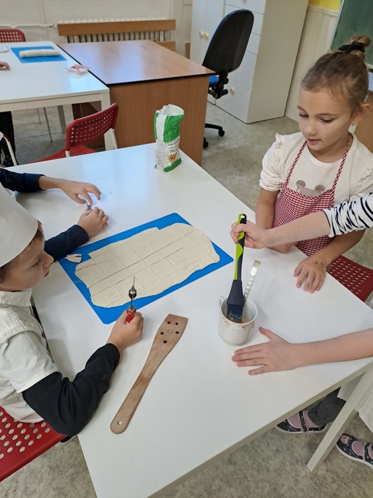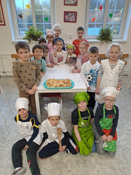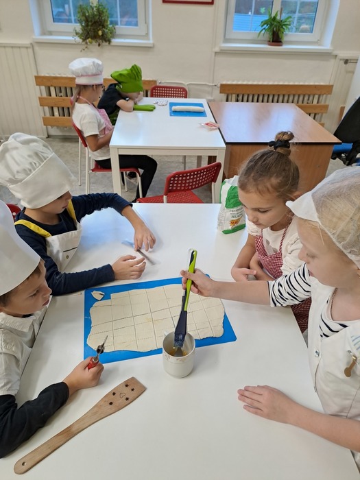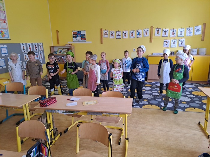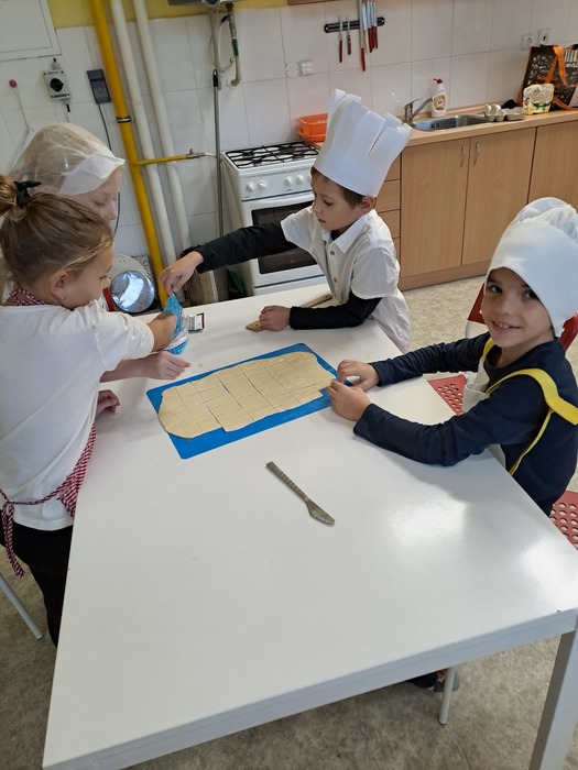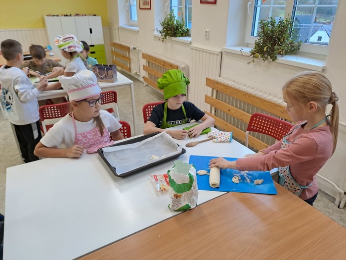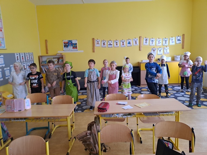 Jako všechny ostatní třídy prvního stupně se i druháci zapojili do projektu Hrdá škola, tentokrát na téma kuchařky a kuchaři. Děti se opět sešly ve stylovém oblečení, které jim opravdu slušelo. Ve školní kuchyňce si upekly z listového těsta oblíbené šneky a slané tyčinky. Snažily se vypsat co nejvíce kuchyňských pomůcek, náčiní, spotřebičů… Připomněly si základy správného stolování. Nakonec se každý pokusil sestavit seznam potravin a přísad, které by potřeboval k přípravě svého oblíbeného jídla a nechyběl ani taneček.