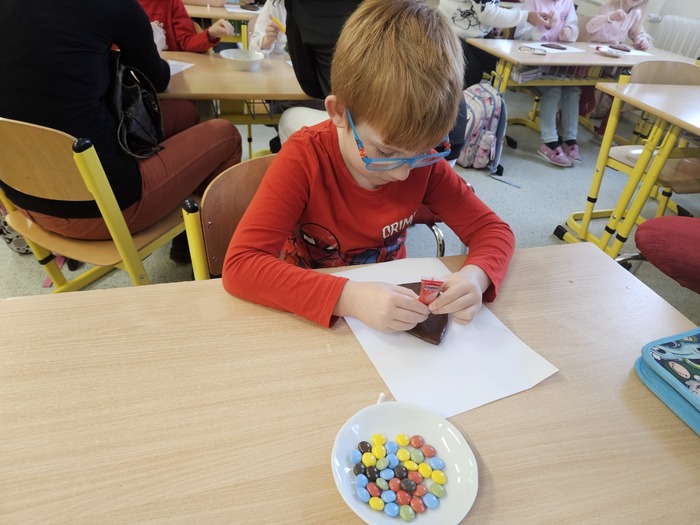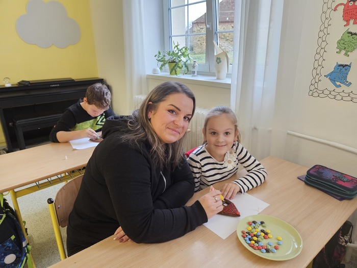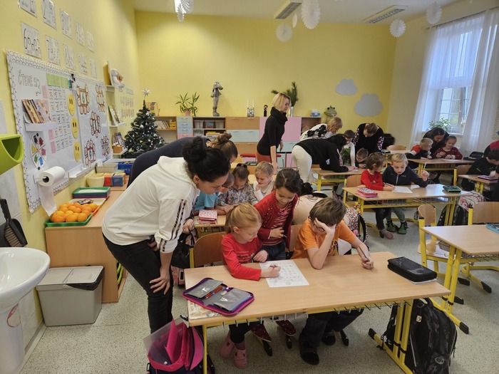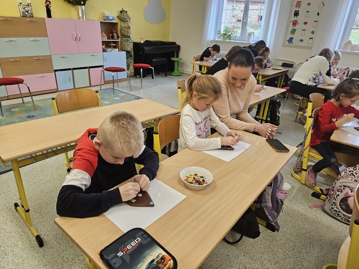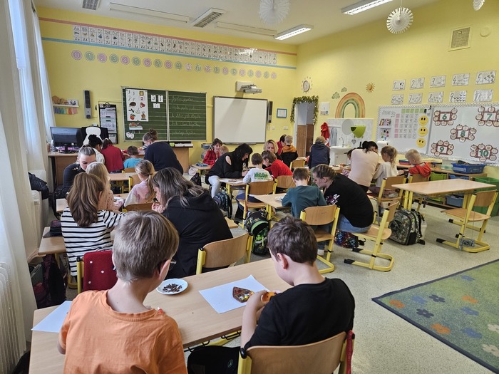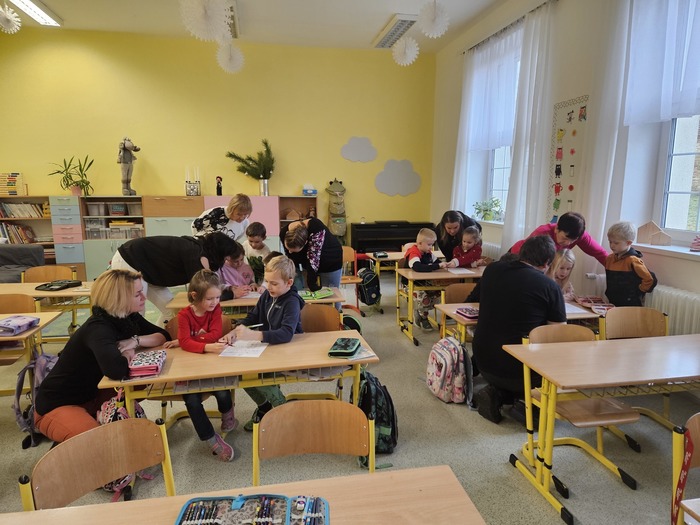 Hlavní část dne však patřila společnému setkání s rodiči. Na dvě hodiny jsme do třídy pozvali nejen maminky a tatínky, ale i další blízké, aby se mohli podívat, jak se děti učí a pracují ve škole. Prvňáčci jim s nadšením ukázali, co všechno už zvládnou.