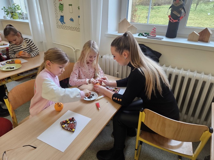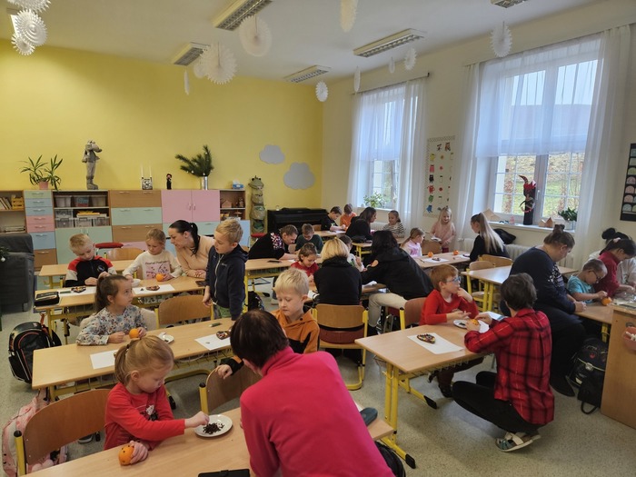 Vyvrcholením dne byla tvořivá dílnička. Společně s rodiči si ozdobili perníkové chaloupky a zároveň si vytvořili krásnou přírodní dekoraci z pomeranče a hřebíčku. Vůně, která se při tvoření linula třídou, navodila tu pravou adventní náladu.