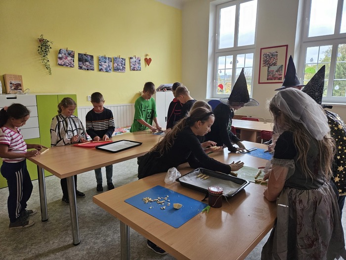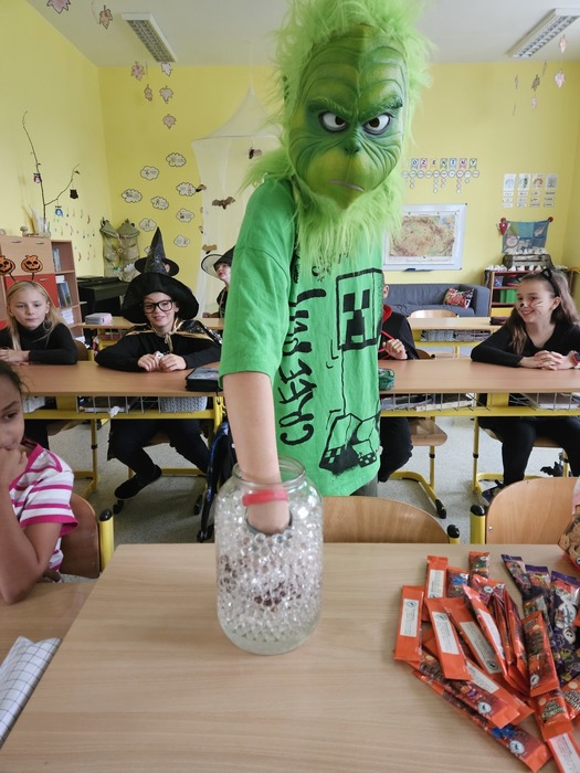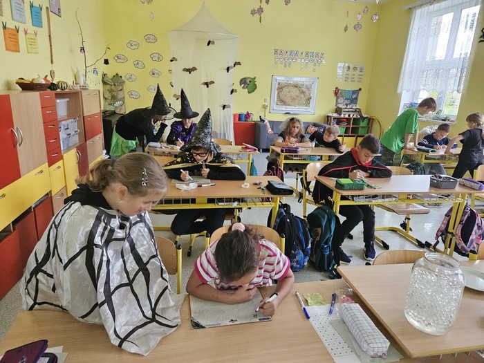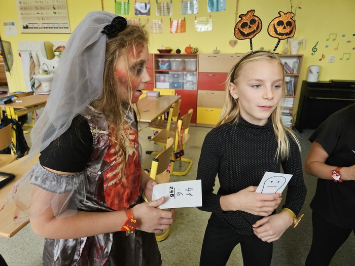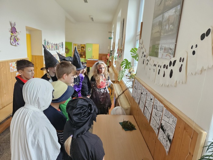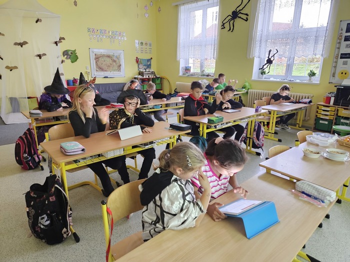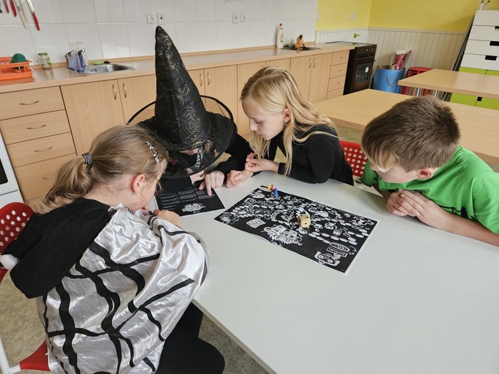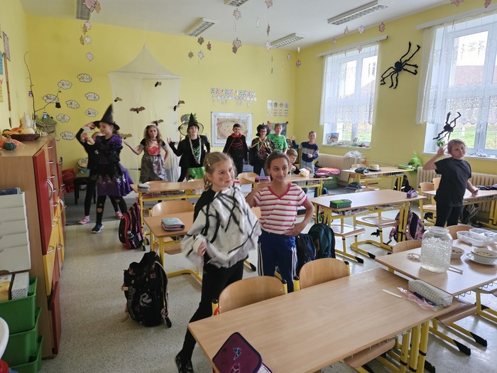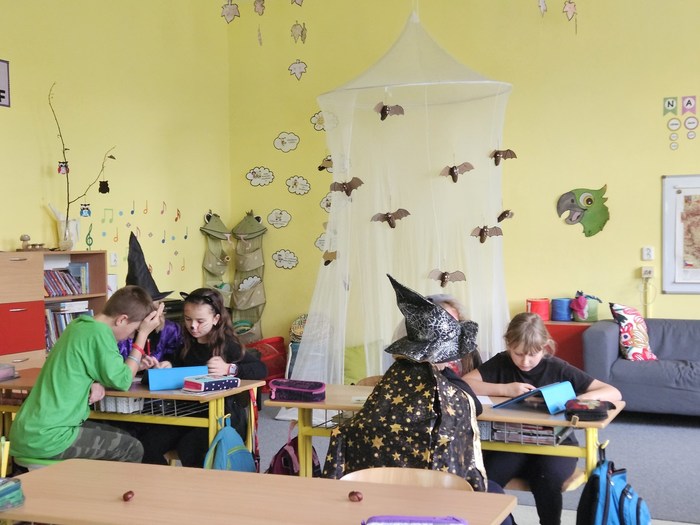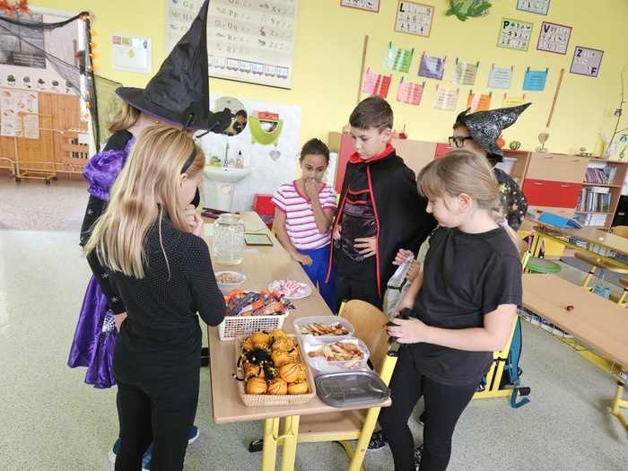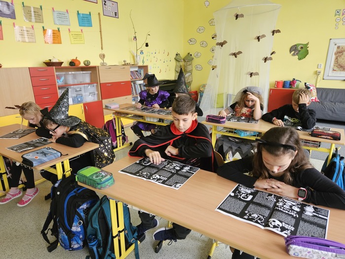Halloweenskou náladu zažili v úterý i čtvrťáci na naší škole. Čekalo je tematické vyučování, kde se do běžných hodin připletlo počítání s duchy, překonání strašidelné únikovky, čtení hororů, tančení s kostlivci nebo pečení prstů z lineckého těsta. Děti si zahrály i deskovou hru Strašidelná škola, ve které překonaly například plešatou školnici nebo šíleného matikáře.