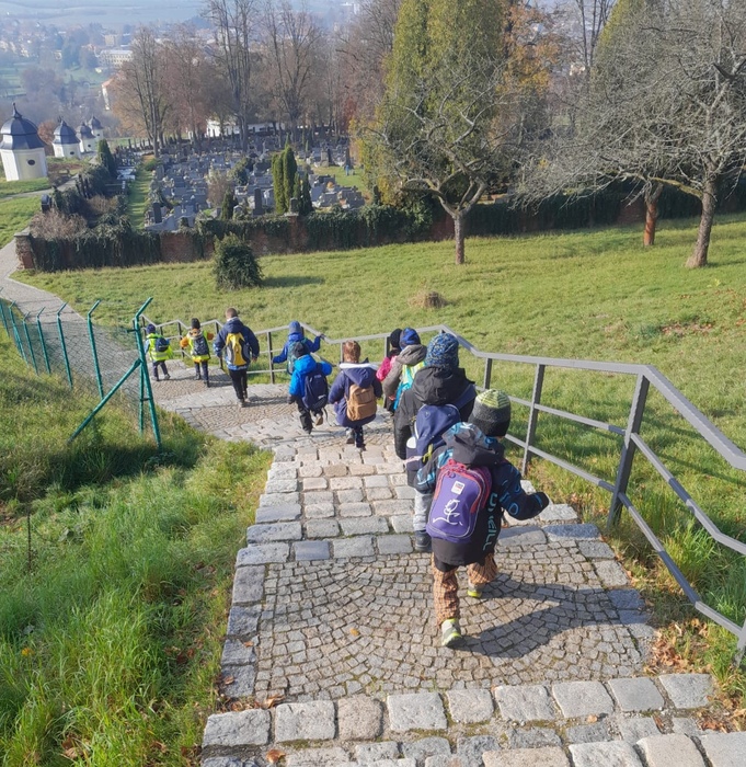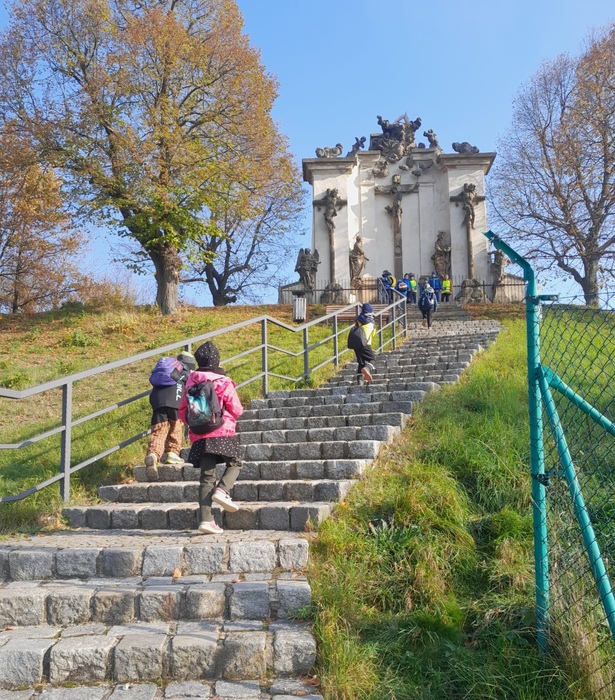 Počasí nám přálo, sluníčko hezky svítilo a naše cesta pokračovala na Křížový vrch kolem místního hřbitova až