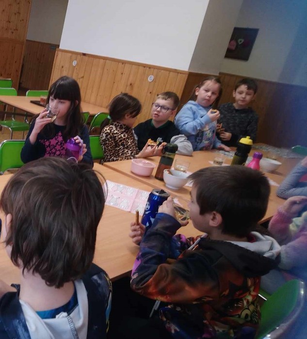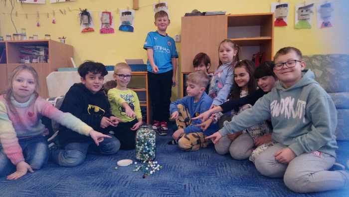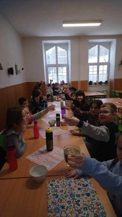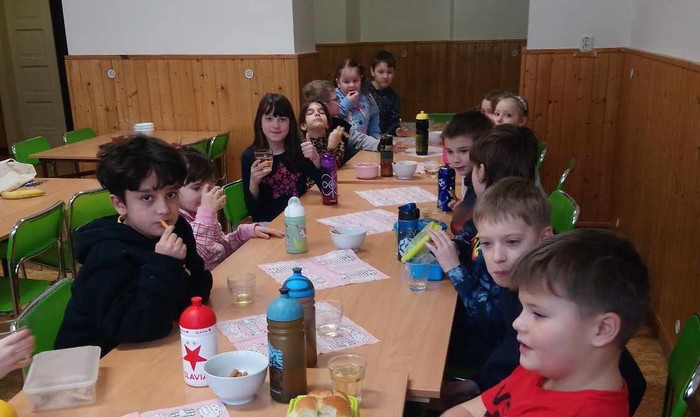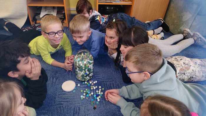Pololetní vysvědčení je už sice za námi, ale děti ze třetí třídy se ještě jednou ohlédly za svou prací v prvním pololetí. Už od září totiž jejich školní úsilí dostalo podobu barevných kuliček. Zvláště tehdy, když byla učební látka ještě nová – neprocvičená, stál každý úkol více úsilí. A takové úsilí bývá odměněno kuličkou, kterou si děti sbírají do skleničky. Jednou za čas se všechny kuličky přesypou do ohromné sklenice. Shodou okolností se sklenice naplnila právě v pololetí, a tak si děti kromě vysvědčení mohly potěžkat pětilitrovou lahev plnou zvládnutých příkladů, doplňovacích cvičení a jiných samostatných úkolů. Za odměnu si pochutnaly na výborné pizze a připily si jablkovým džusem.