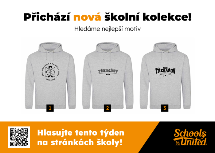 do školy přichází nová školní kolekce oblečení a jste to právě Vy, kdo rozhodne o její podobě! Hlasujte do 12.4.2024 o tom, který ze tří motivů se Vám líbí nejvíce. Vítězný motiv potom použijeme na vytvoření celé výroční kolekce, kde najdete nejen mikiny a trička, ale i tepláky, batohy, čepice a další kousky.