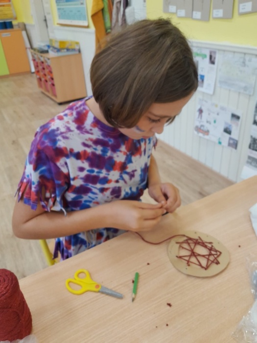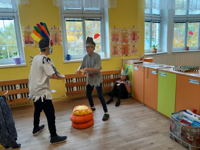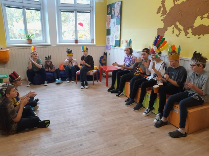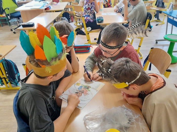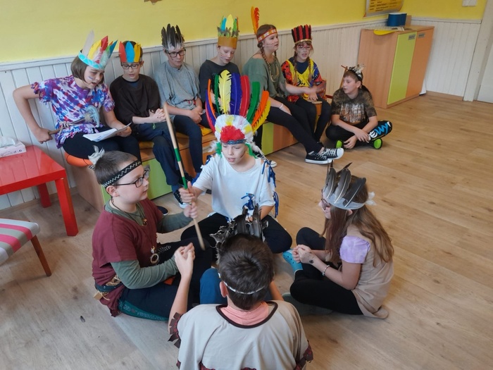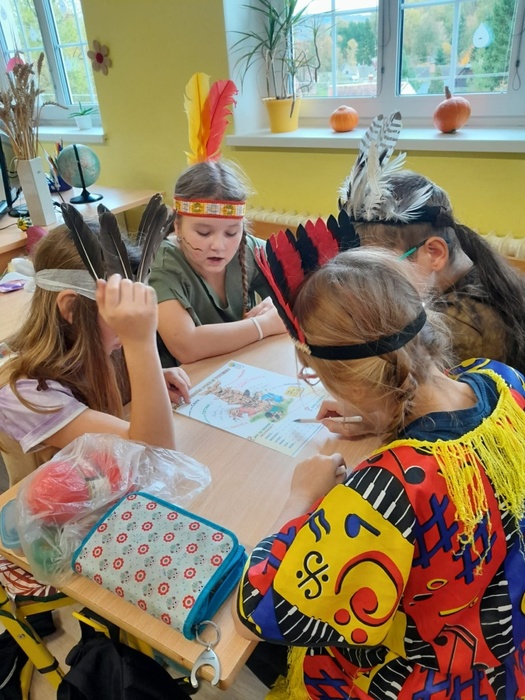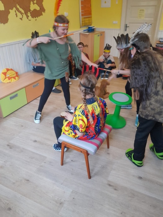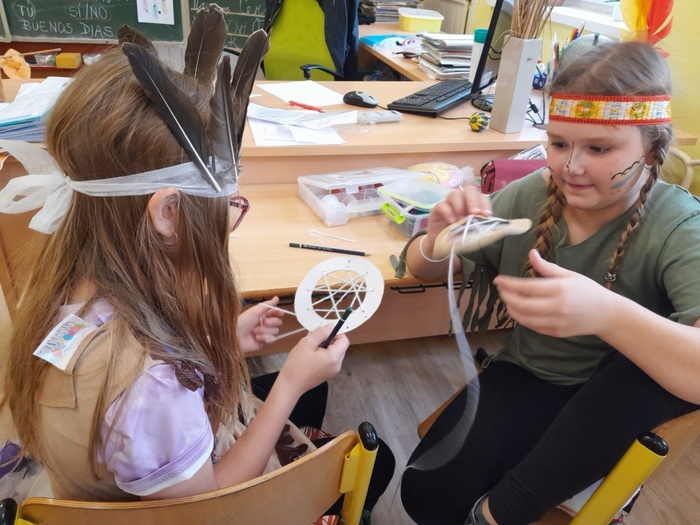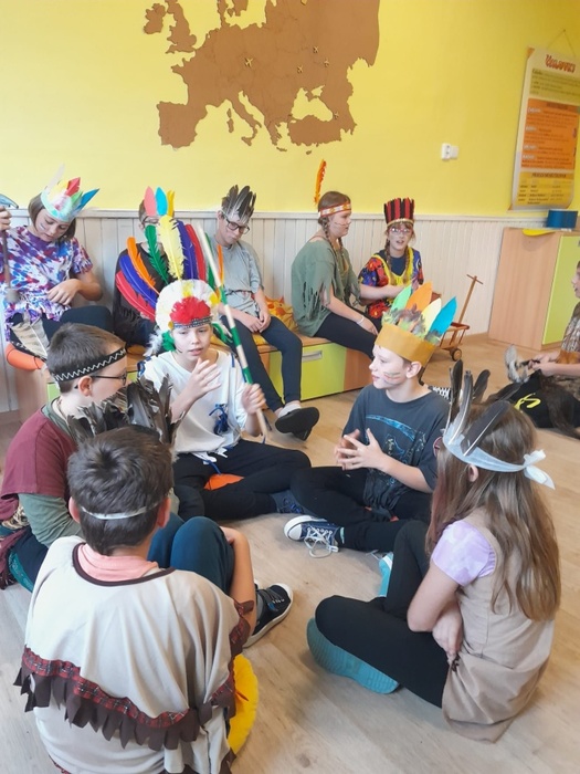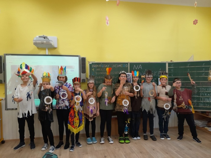 Prostřednictvím aktivit se děti dozvídají nové informace ze života indiánů. A tak se během tematického vyučování bubnovalo, hrály se různé hry, vymýšlel se indiánský bojový tanec a pokřik, nechyběl ani poslech indiánských písní. Ve skupinách se spolupracovalo, řešily se zapeklité úkoly. Každý si vyrobil lapač snů a upletl náramek.