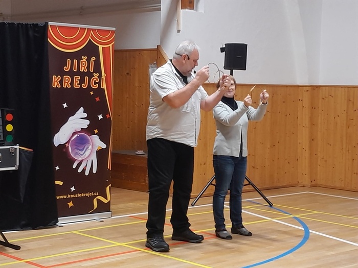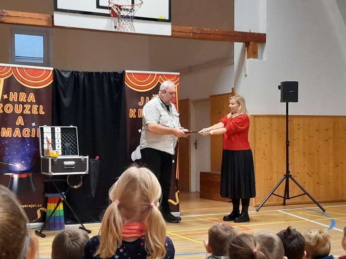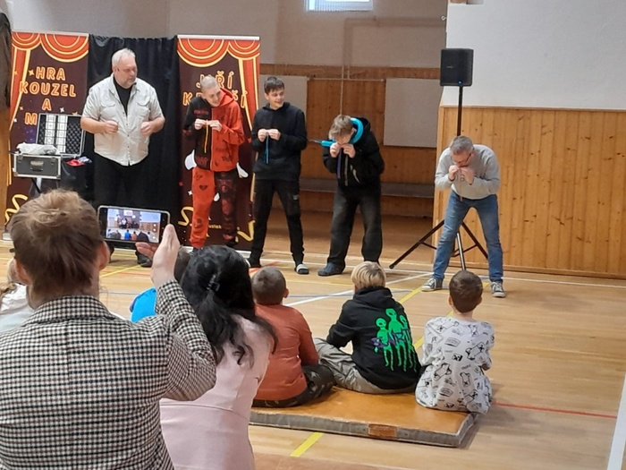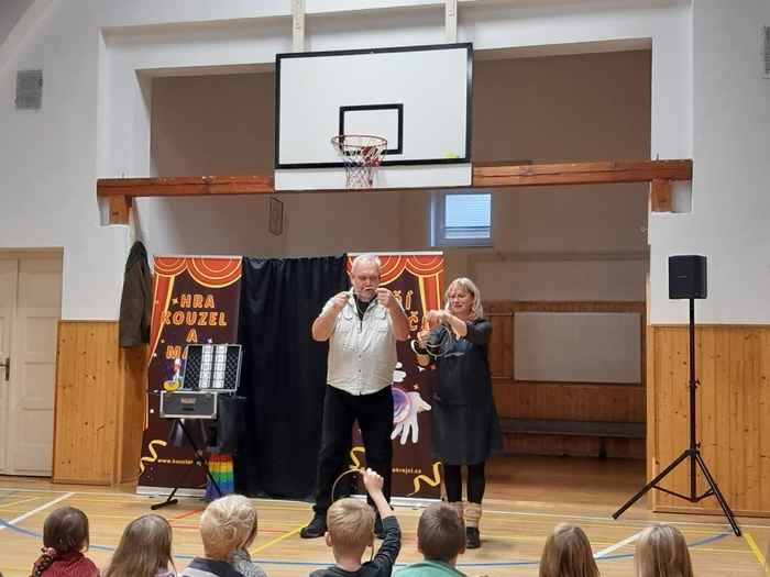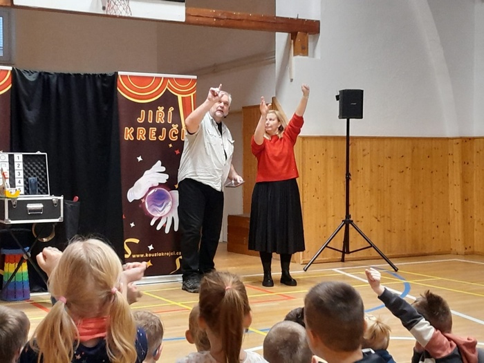 Děti byly naprosto nadšené. Aktivně se zapojily do čarování a kouzlení. I učitelé si několik jednoduchých triků vyzkoušeli.