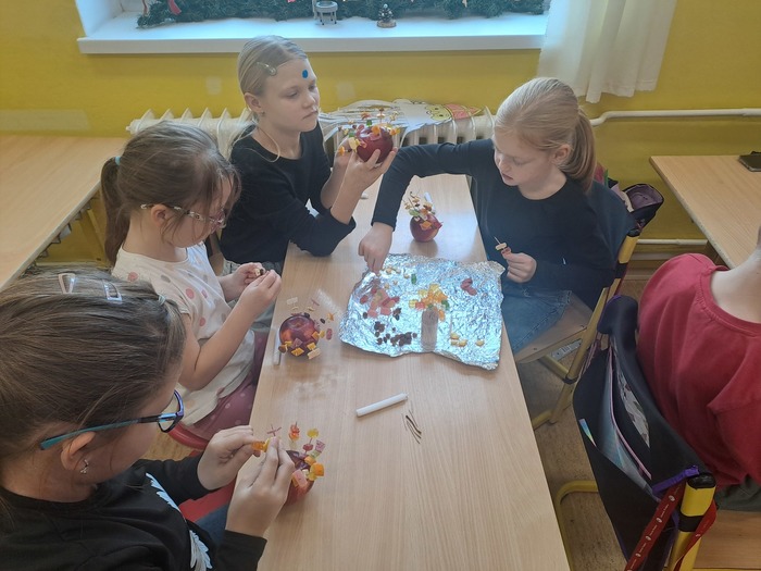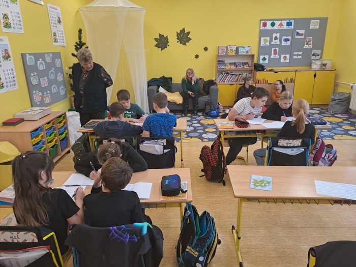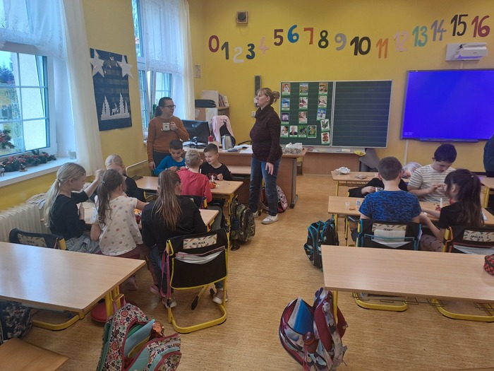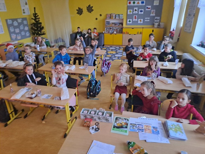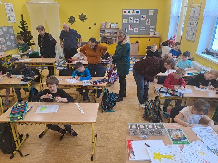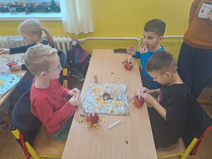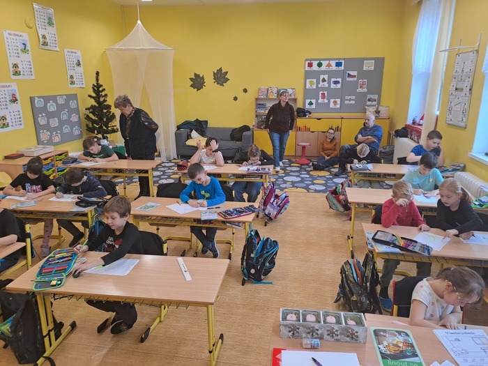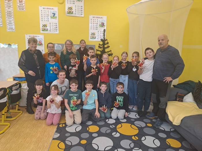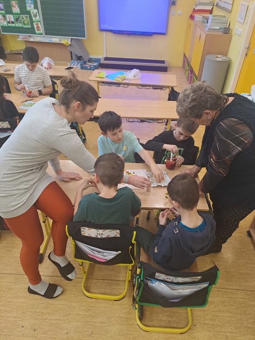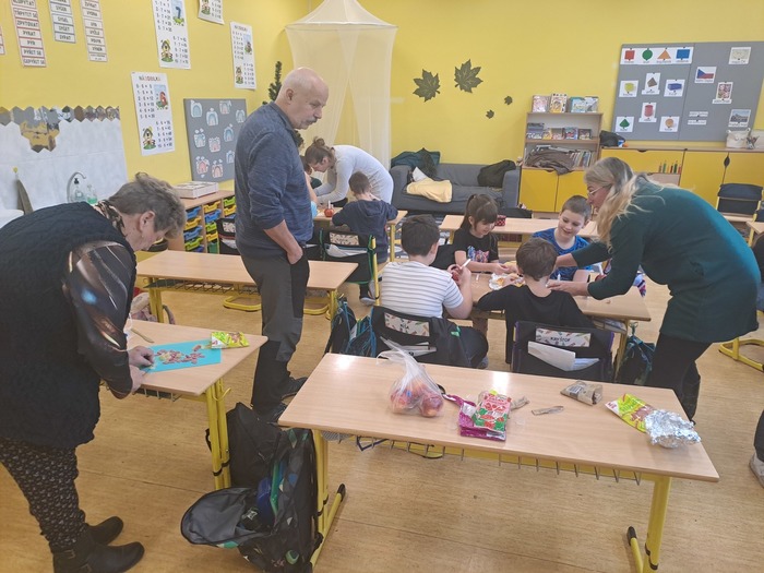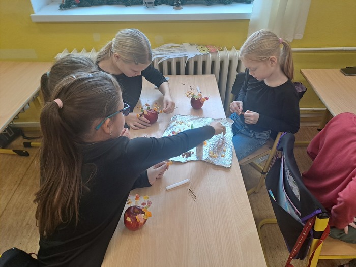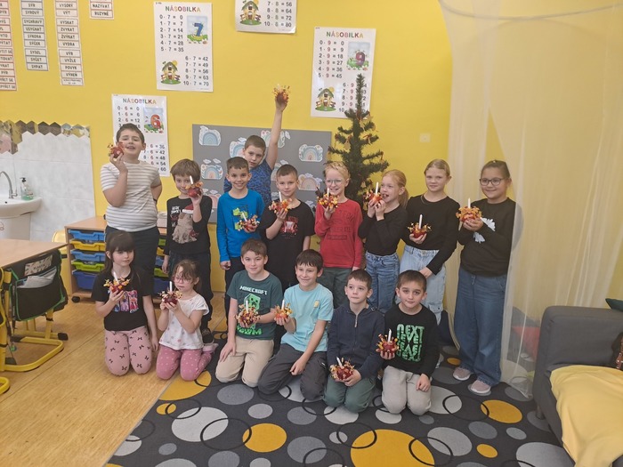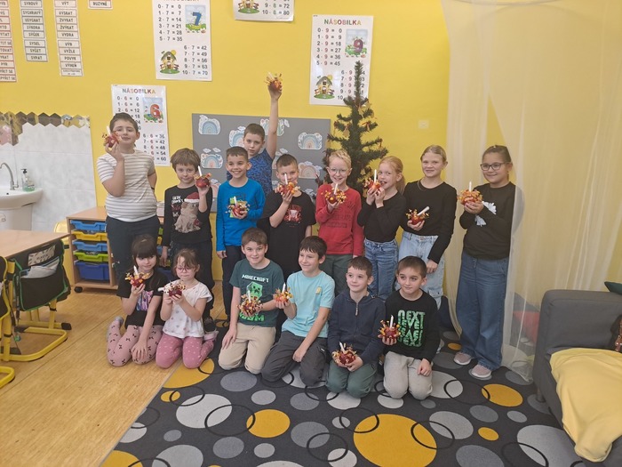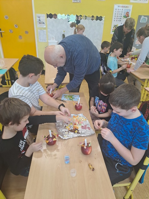 Děti ze třetí třídy pozvaly své rodiče a prarodiče, aby jim ukázaly, jak zvládají například vyjmenovaná slova, násobilku…Pracovaly samostatně i ve skupinách a přítomní rodiče mohli ocenit jejich vědomosti a snahu. Pak si společně udělali vánoční svícen z jablka.