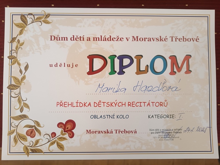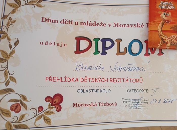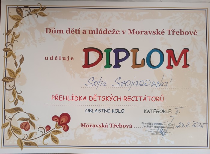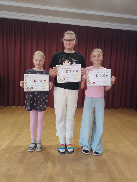 Ve dnech 24. 2. a 25. 2. 2025 proběhlo oblastní kolo v RECITACI. Soutěž se uskutečnila v Moravské Třebové a byla rozdělena do pěti kategorií. Naši školu reprezentovali žáci 1. stupně (Lilien Práčková, Ema Žáková, Barbora Švichká, Jakub Ježek, Amálie Štarmanová, Marika Handlová, Amálie Olosová, Daniela Jarošová, Sofie Svojanovská, Eliška Lochmanová) a dvě žákyně 2. stupně (Tereza Berková a Linda Kolomá).