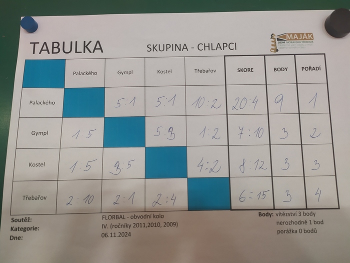 Mužstvo složené z deseti chlapců 8. a 9. třídy se zúčastnilo turnaje ve florbale, který se konal v tělocvičně moravskotřebovského gymnázia. Do obvodního kola tohoto klání se přihlásily čtyři školy a hrálo se systémem „každý s každým“.