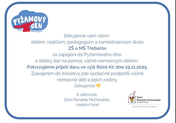 Na Základní škole Třebařov to v pátek 14. 11. 2025 rozhodně nevypadalo jako běžný školní den. Chodby zaplnila pestrá směs pyžam, županů, papučí a veselých čepic. Žáci, učitelé i zaměstnanci školy se zapojili do Pyžamového dne, který měl nejen pobavit, ale zároveň upozornit na důležitou myšlenku – podporu dětí dlouhodobě bojujících s vážnými nemocemi.