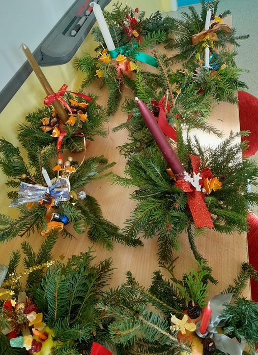 Ty si nejprve ze svíček, jablíček, jehličí a vánočních ozdob vyrobily vánoční svícny. Každý byl jiný, všechny byly povedené.