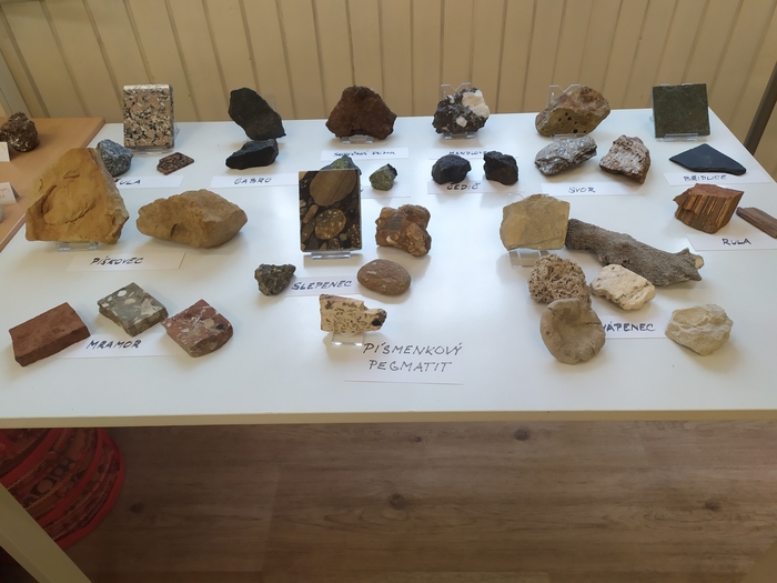 Krásnou výstavu minerálů a hornin uspořádali vybraní žáci V. a IX. třídy. Žáci si přinesli vlastní vzorečky minerálů, které pan učitel Kolbábek doplnil výběrovými kameny ze školní sbírky.