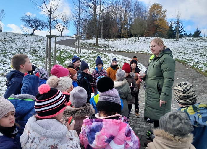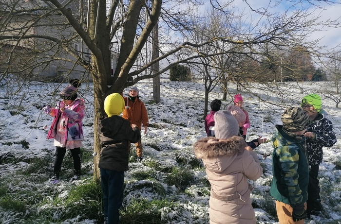 Pro ptáčky vyrobili lojové koule, plné semínek. Ty jsme pak společně zavěsili na stromy v okolí naší školy. Venku žáčci hledali ještě stopy po zvířátkách a našli jich spoustu.