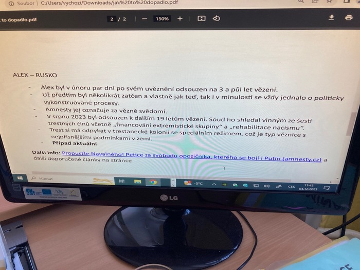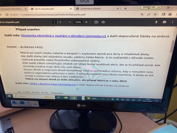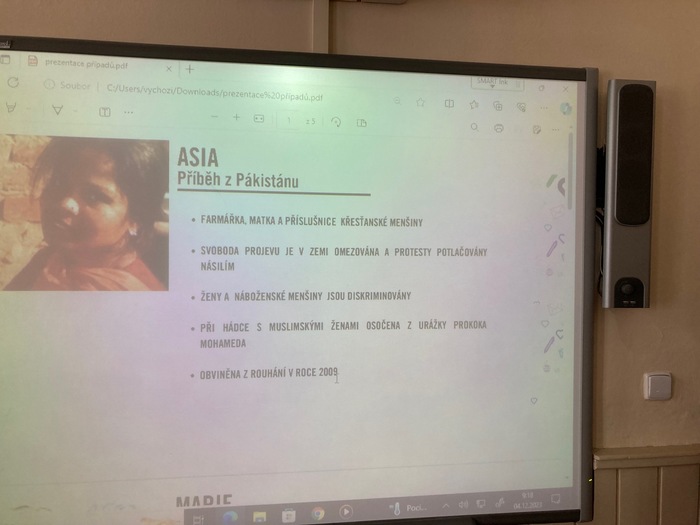 V pondělí 4. 12. absolvovali žáci 8. a 9. třídy dvouhodinové workshopy na téma ÚVOD DO LIDSKÝCH PRÁV, které byly vedeny formou zážitkových aktivit, diskuzí a skupinové práce. Zaměřily se na předání základních znalostí v oblasti lidských práv. Žáci si osvojili důležité pojmy, seznámili se s Všeobecnou deklarací lidských práv, vyzkoušeli si být v roli lidí, kterým jsou upírána lidská práva, měli možnost dokončit, podle vlastní volby, příběhy nespravedlivě stíhaných lidí. Byla jim také více přiblížena další aktivita, která je bude v nejbližší době čekat – Maraton psaní dopisů.