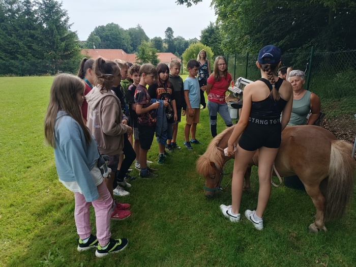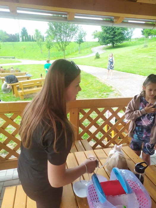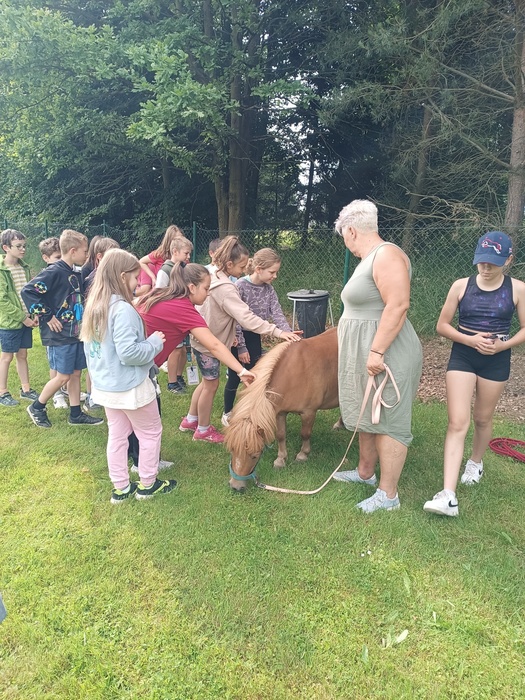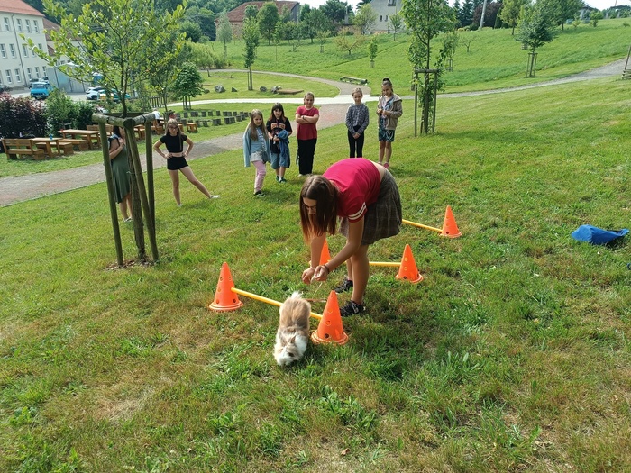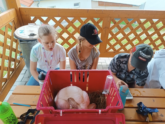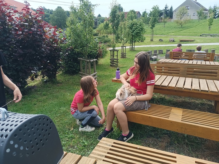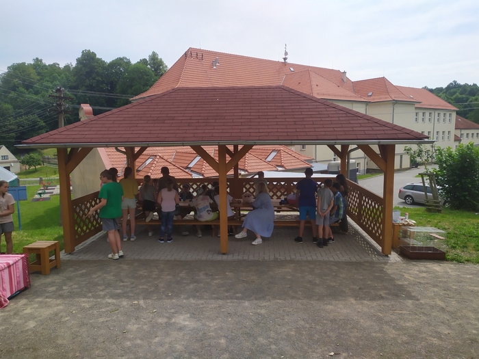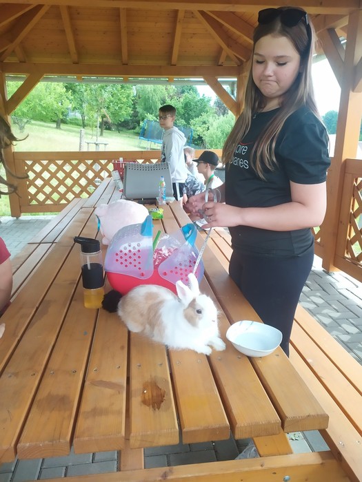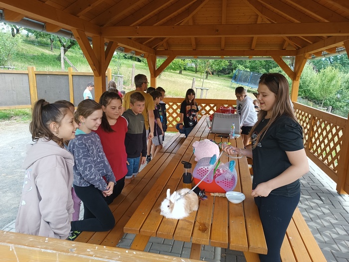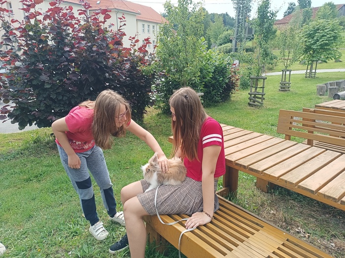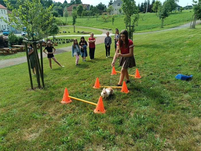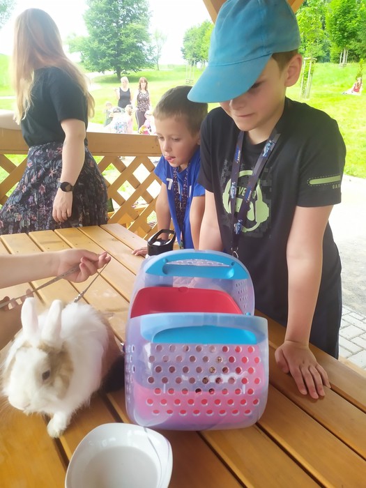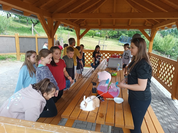 Ve školním altánu našla dočasné útočiště trojice králíků Sněhurka, Milík a Ňufík, trošku nervózní fenky jezevčíků Ťapka a Betka, pohodový sameček morčete Quick a kočka Málinka. Na školním hřišti se pásl poník Tofík.