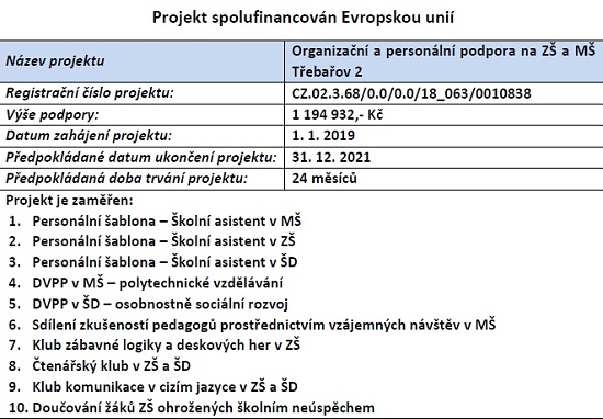 Cílem projektu je poskytnutí podpory MŠ, ZŠ a ŠD v podobě personální podpory, podpora profesního růstu pedagogických pracovníků, posílení vzájemné spolupráce mezi školami a realizace volnočasových aktivit vedoucí k rozvoji klíčových kompetencí žáků.